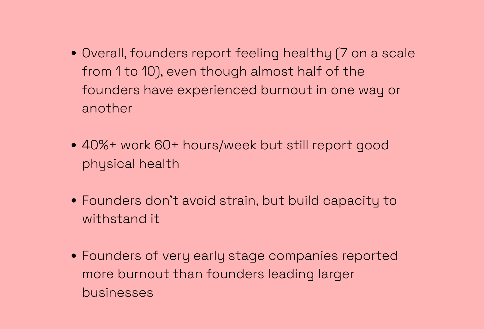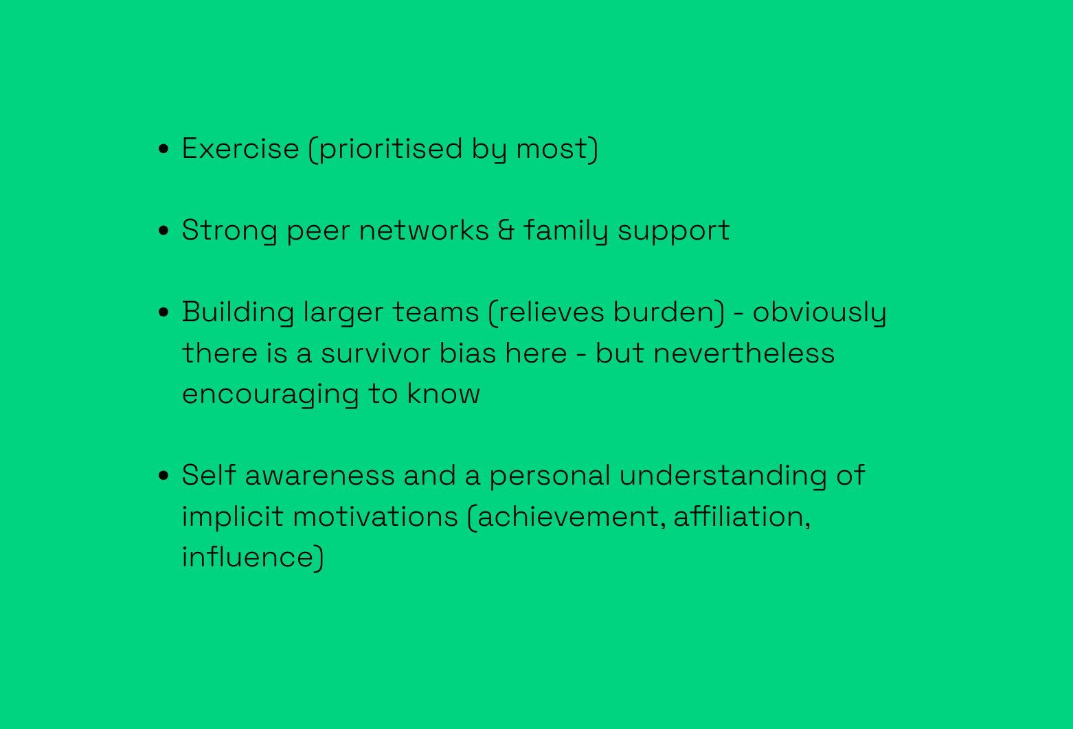 The early stages of building a company often feel exhilarating, but the real strain comes later, when long hours, sleepless nights, investor pressures, and isolation compound. This report stems from a personal passion of mine: I deeply believe that a healthy mind and body are the foundation of clarity and lasting performance. Every founder has different levels of resilience and unique ways of coping with pressure, and in this report you’ll find a wide range of practical strategies and lived experiences.
